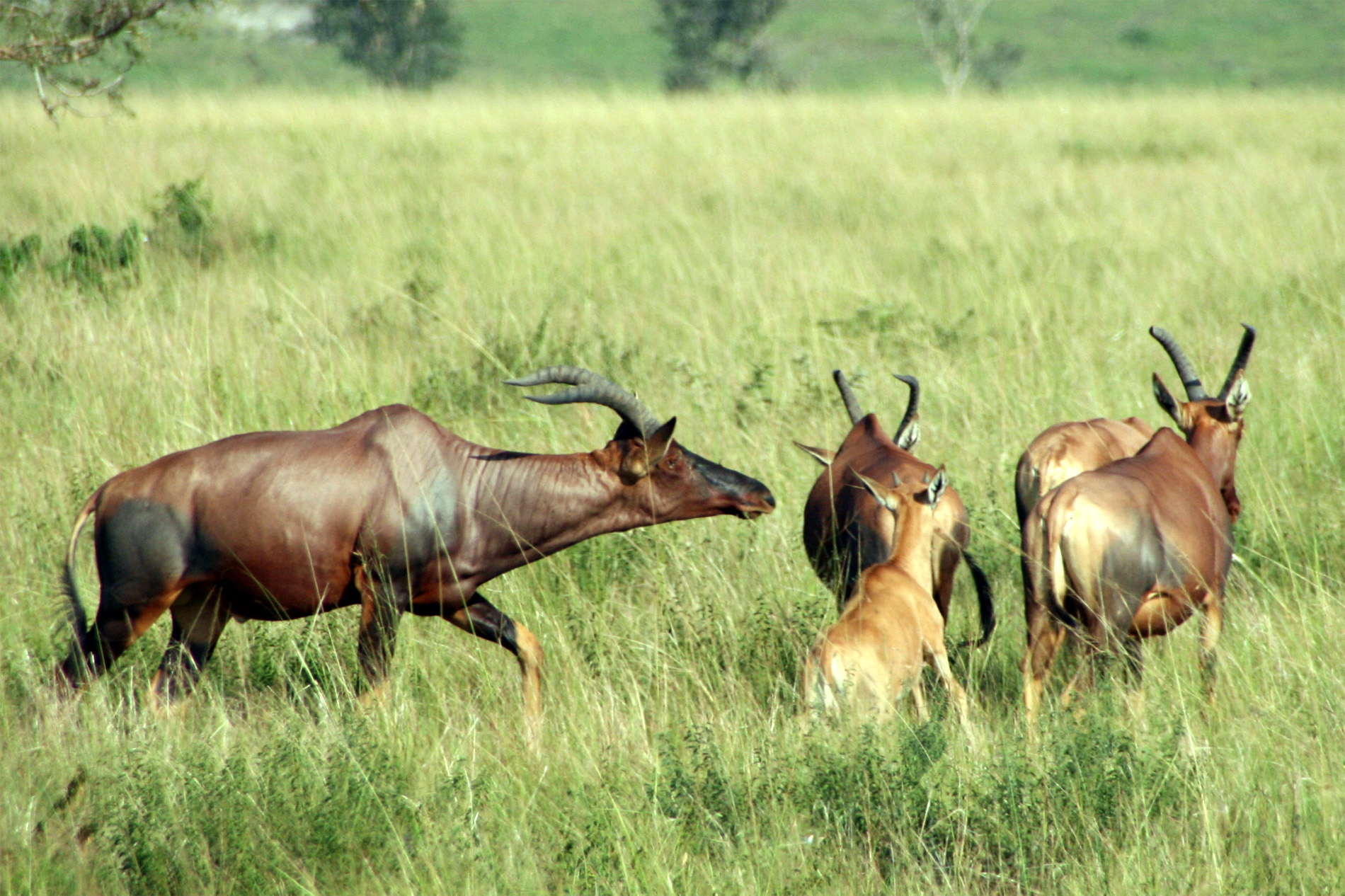 Distinctive black patches appear on the face, upper forelegs, hips and thighs of the topi.